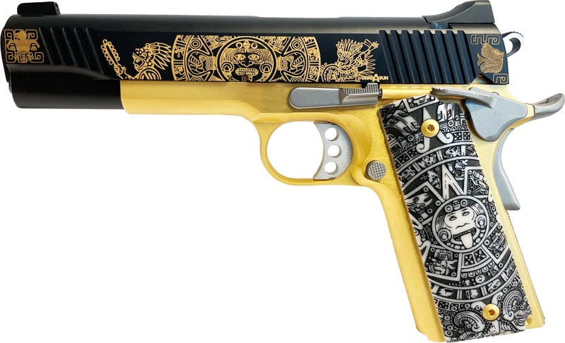 The Kimber Custom II “Aztec” 1911 is a limited production Machine Guns Kings exclusive. This one of a kind pistol is gold engraved with 24 Carat gold Aztec symbols. Stand out at the range with this elegant yet flashing one of a kind 1911. Get the best 1911s for sale today at Machine Guns Kings.com