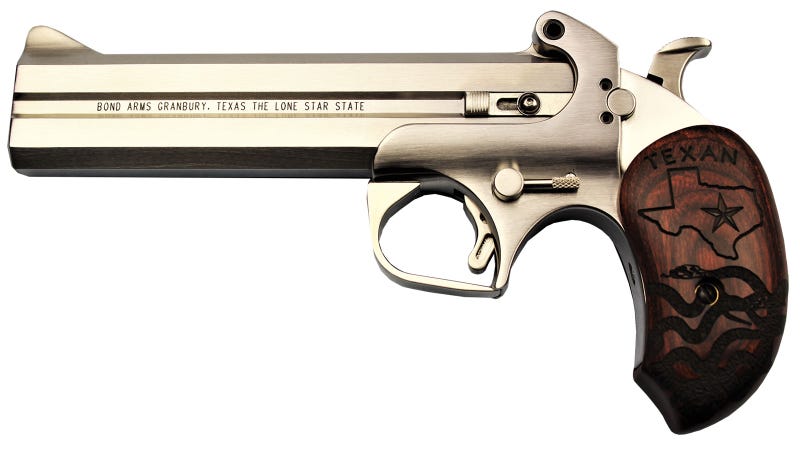 Bond Arms’ intimidating TEXAN packs a big punch! Featuring a 6 inch barrel .410/.45 Colt barrel, the Bond Arms Texan is sure to impress! An extended rosewood grip features an outline of the state of Texas with a star as well as snakes criss-crossing at the bottom. The 6%u2033 double-barrel is chambered to handle up to 3 inch .410 shot shells and .45 Colt.